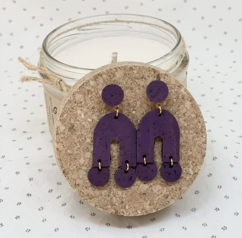 Boucles d’oreilles en forme d’arc-en-ciel réalisées en liège, un matériau naturel pour un bijou à la fois tendance et écoresponsable.