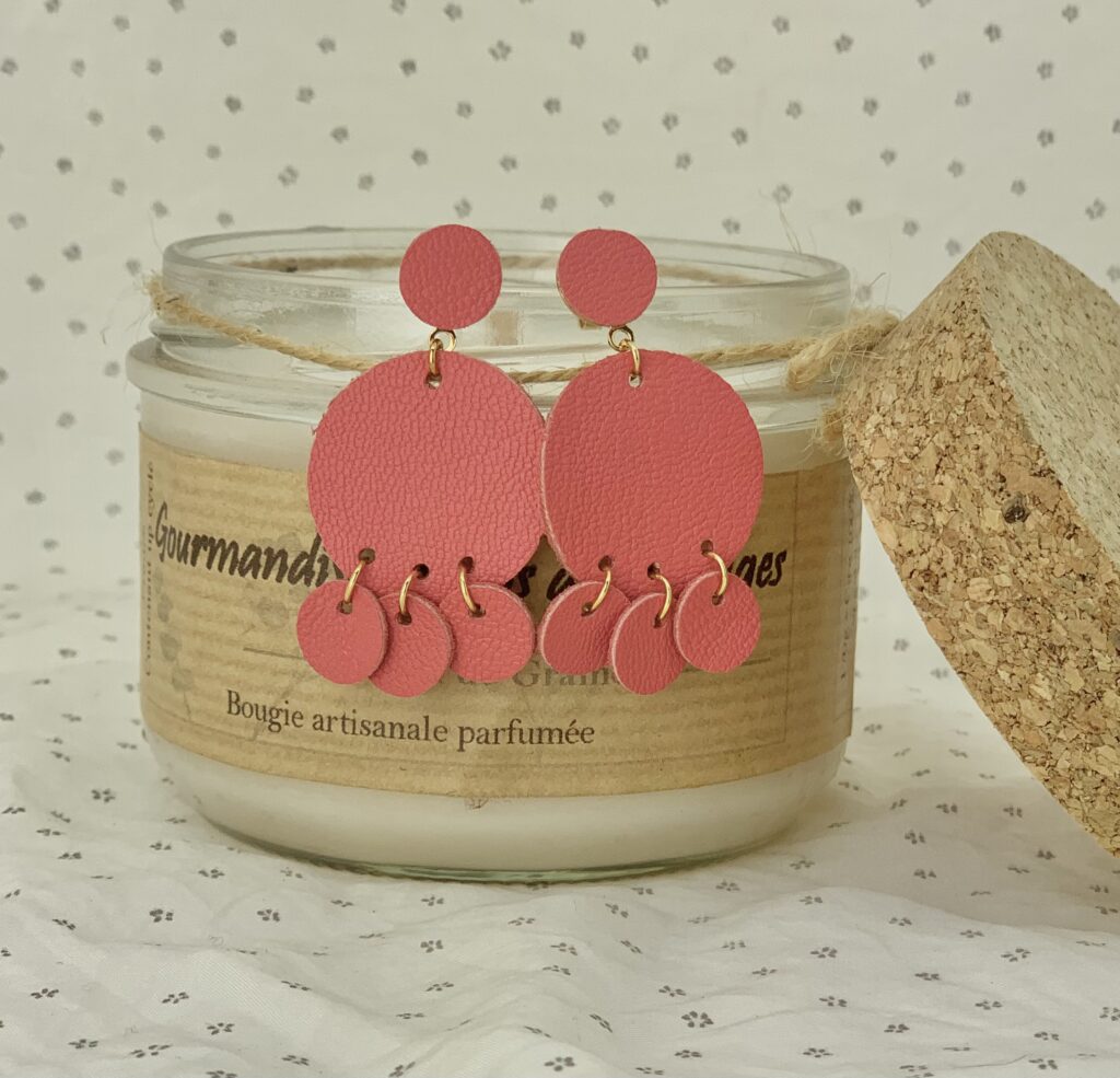 Boucles d’oreilles en cuir, composées d’un rond principal de 2 cm de diamètre, auquel sont suspendus trois petits ronds de 1 cm de diamètre.