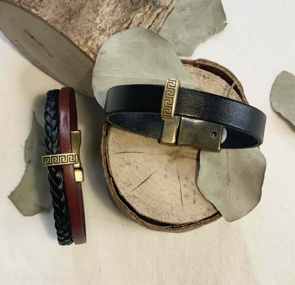 Chaque bracelet est orné d’un poussoir rectangle motif frise antique en placage bronze, apportant une touche élégante et authentique.