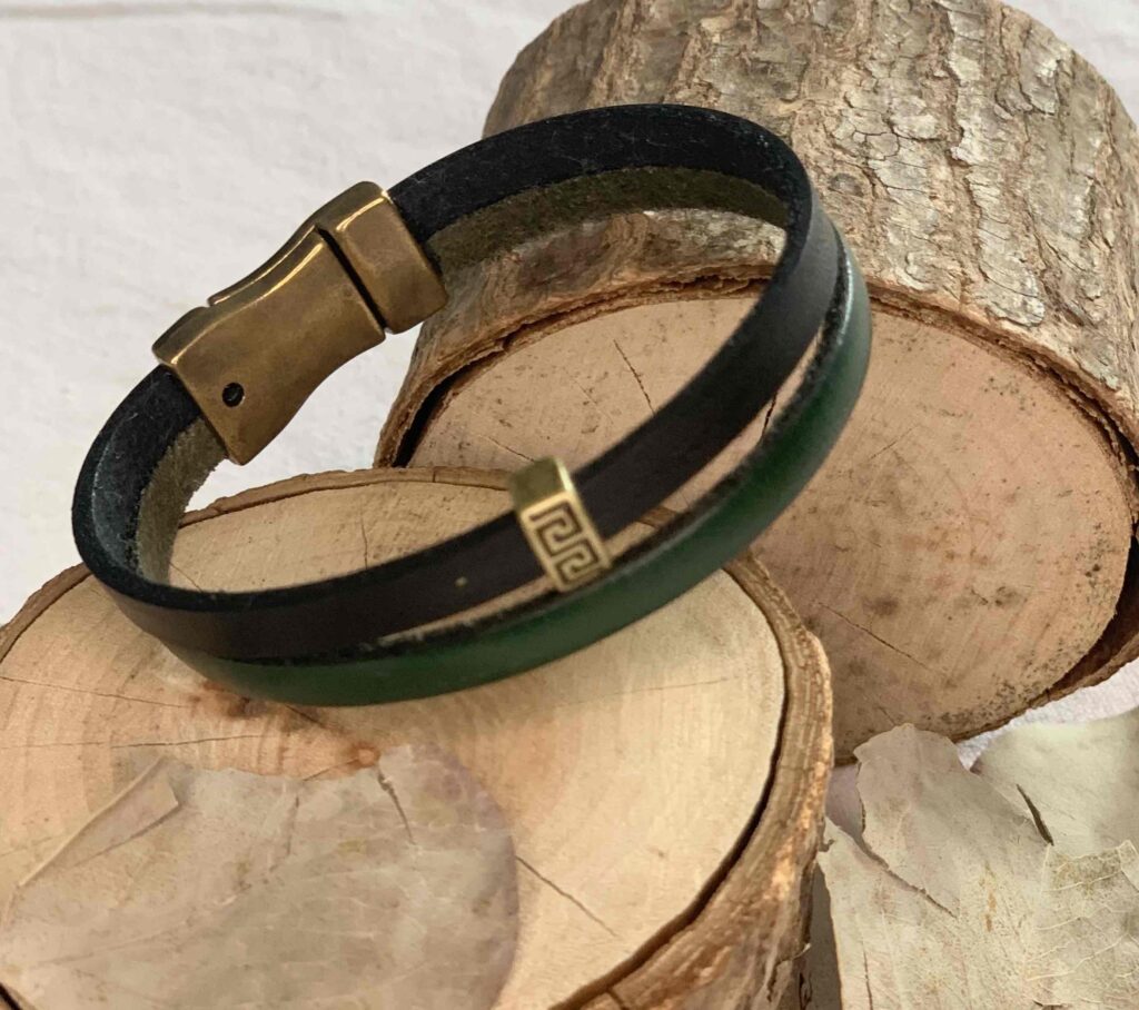 Bracelet en lacets de cuir noir et vert, d’une largeur de 0,5 cm chacun.