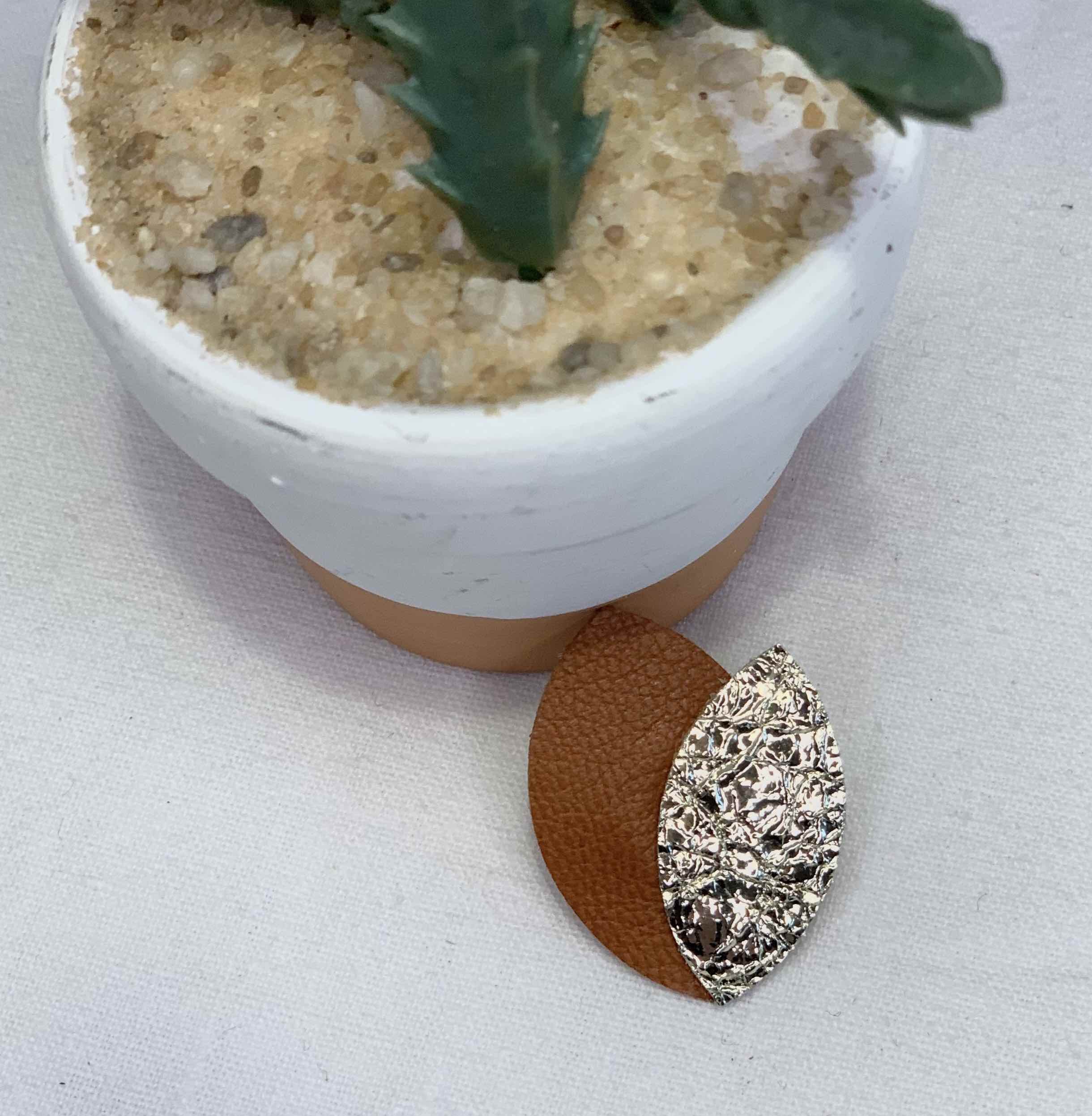 Pin’s double feuilles en cuir lisse marron et cuir doré avec incrustation